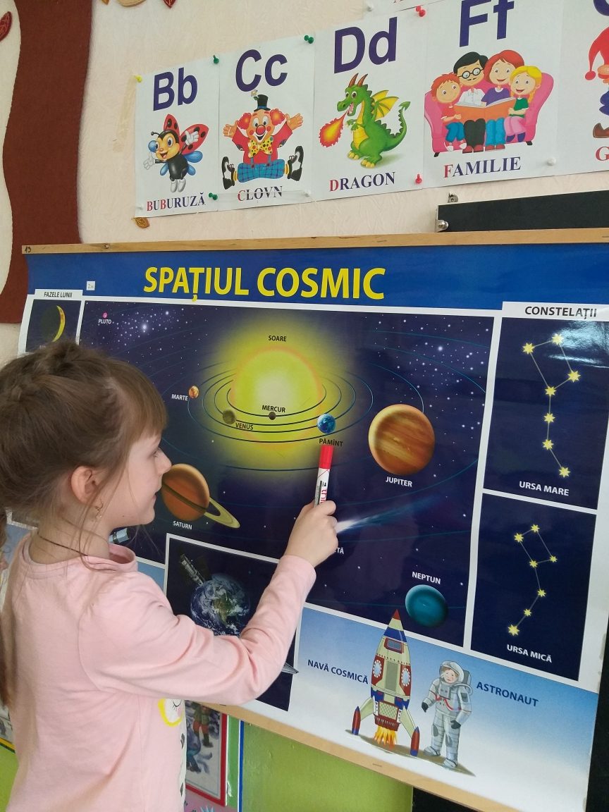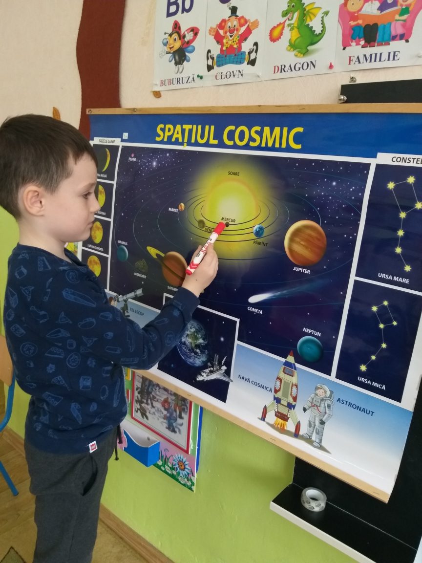„O călătorie in spațiul cosmic”- aceasta este tema pe care și- au dorit so exploreze  copiii din grupa pregătitoare nr.5 ” Fluturașii”.Fiind pentru o zi in rol de mici cosmonauti, copiii au fost entuziasmați să afle cît mai multe despre secretele universului.